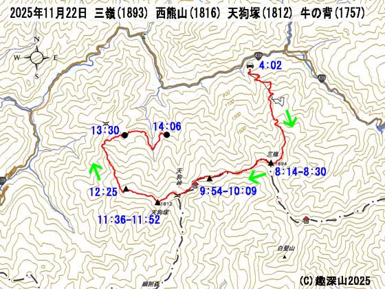 HOME > 山行記録 >三嶺(1893)西熊山(1816)天狗塚(1812)牛の背(1757) > 2025年11月22日