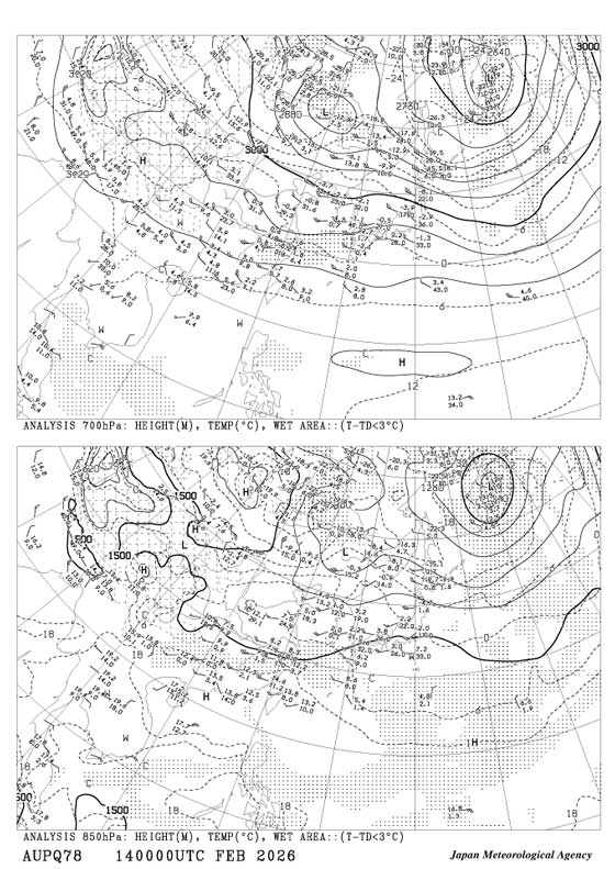 2026年2月14日 午前9時 850,700hPa高層天気図