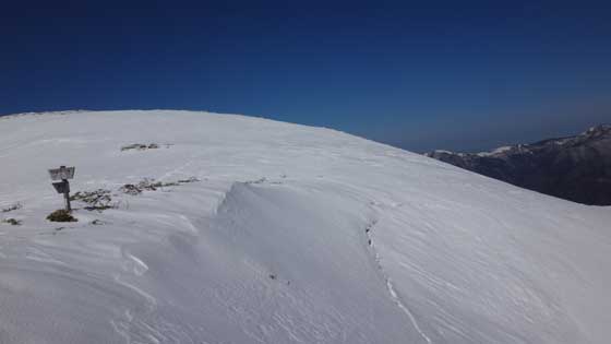 上部では 積雪量も増えているが、風が強くトレースも消えかけて痕跡となっている 箇所もでてくる。