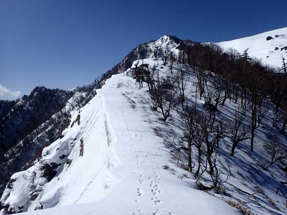積雪期限定の 西熊山への 雪稜 を辿るが 南面の雪庇の発達が著しく なっていて 雪稜の根本には クラックが 入っている箇所が いくつもあり 慎重にルートを選択する。