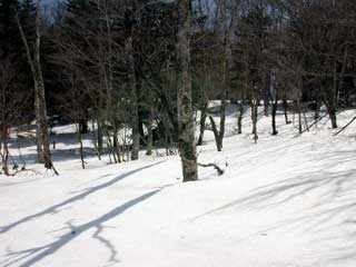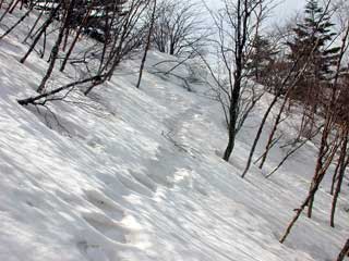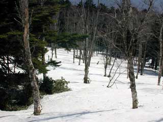 適当な針葉樹林帯から取り付く。雪解けとともに 雪の下で寝ていた藪が勢いよく一気に立ち上がっていくのを感じだ。