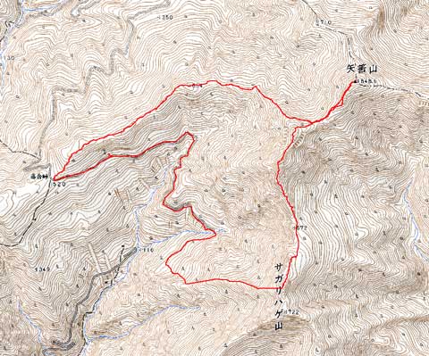 国道439号 鎖谷---三加茂東祖谷山線駐車地点 6:58--取付点 7:08 -- サガリハゲ(9:15-10:10) ---最低鞍部 10:42--南峰 11:29--岩峰 12:09--鞍部 12:22--矢筈山 (12:54-14:15) -- サガリハゲ分岐 14:56 --落合峠 15:59---三加茂東祖谷山線駐車地点 16:37 -- 鎖谷国道四三九号