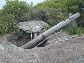 西山集落 樹林帯を抜けるあたり 天狗塚 池の付近 池の水は干上がっていた。 天狗塚方面を振り返る 三嶺山頂標識が取り替えられる前工事中 岩の上に樹木 モノレール