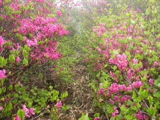 10時55分天狗塚山頂 「北西の風やや冷たい プラス9度 じっとしていると肌寒い 風がガスと一緒にながれる 一瞬ガスがうっすらとなり 雲が薄くなって 太陽が僅かに近くなったと感じられたがまたすぐにガス。ツツジは少し残っていた。」