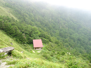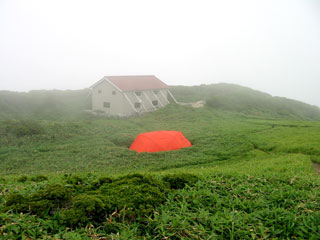牛の背より天狗塚 稜線南側にある「お亀岩避難小屋」 三嶺ヒュッテの前にテント 三嶺ヒュッテ付近の菅生下山道標識