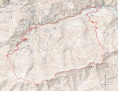 三嶺山頂 から 菅生 いやしの温泉郷 (青少年旅行村)間の登山道(GPSトラックログによる)