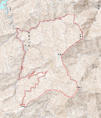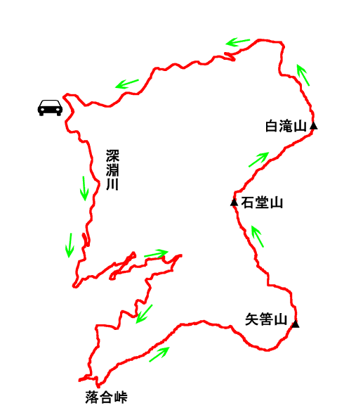 深淵 7:24 --落合峠 (9:42-10:12) -- 矢筈山 (13:50-14:23)-- 石堂山 15:31 -- 白滝山 16:18 --風呂塔林道17:04-- 深淵 17:45