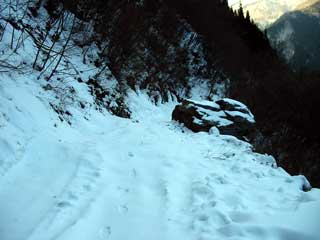 朝の 深淵の 谷には 野生動物が 沢山 動くのか 雪面にアニマルトラックが いっぱい ついている。 ゆっくり 林道を 横切る 野生動物を 見かけた。