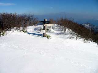 14:00 矢筈山頂「晴 西の風3m -1度 山頂付近にあった 雲もとれてきた。日ざしが 暖かく感じる。剣山 三嶺 の 稜線 の上に少し 石立山が見える。 三嶺 天狗塚 牛の背 が白く見える。」