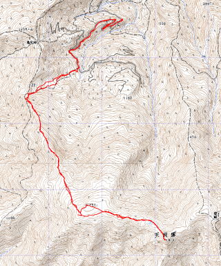 西山林道駐車地点 8:17 --樹林限界 11:43-- 牛の背三角点 12:40 -- 天狗塚 (13:47 -14:20)--樹林限界15:30-- 西山林道駐車地点16:58