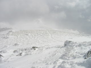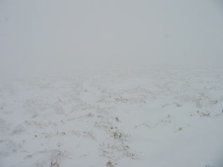 トレースは 風雪で消えていたので、方角を確かめつつ 慎重に下る。見覚えのある 岩や 木 などが出てくると、安心だが、何カ所かは、 雪面 風雪 ガスの白 視界内すべて 全く白一面 で 感覚が 無くなるような ホワイトアウトの所もあった。