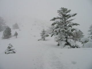 雪は ここ 何日か 降っていいるらしく 木々は 雪の重みで たわんでいる。風が 強く吹くと 木々の雪が一斉に 落ち 視界20mくらいに なる。それでも 人工の針葉樹林帯の中は 比較的安定した積雪状態のラッセルで 上へ 上がっていくことが出来た。 自然林帯 になり 雪が ぐっと 増え 吹きだまりのような ところが出てきてからが 時間が掛かるようになった。