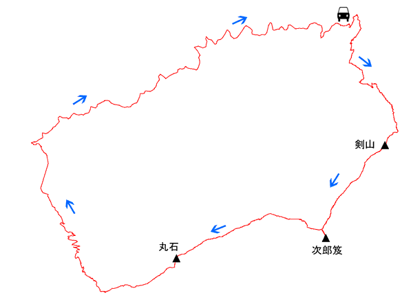 見越 6:52 -- 剣山 (8:36-8:55) --次郎笈 (10:04--10:28) -- 丸石 (11:44-12:15)--丸石避難小屋(12:46-13:21) -- 奥祖谷かずら橋 R439 15:00 -- 見越 16:39