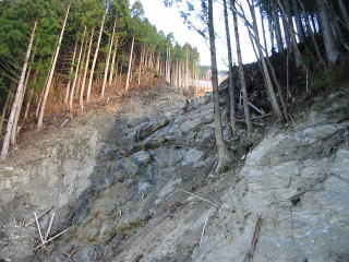 県道崩壊箇所は 昨年5月のときにあった 道路上の 土砂や なぎ倒された樹木は片付けけられているが、 見上げると上の方まで荒々しい傷跡が むき出しに残り 復旧には まだ大分 時間が掛かりそうだ。