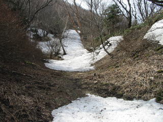 少し下ると 稜線の残雪に 付けられた トレースがあった。