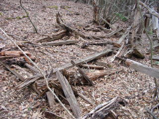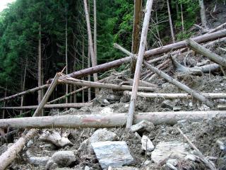 崩壊直後は 岩が 角張って 手が切れるくらい 尖っているのが 散乱していて 足の踏み場もないぐらいの 不安定さのなかを 倒木が幾重にも 積み重なった中を 上からの さらなる 崩壊に気を付けながら 速やかに通過する状態でした。
