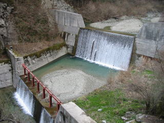 平成16年4月3日 工事中 平成15年5月17日 の 崩壊現場 下流 の砂防ダムは 土砂で満杯 警報装置 「片川に試練あたえし山くずれ