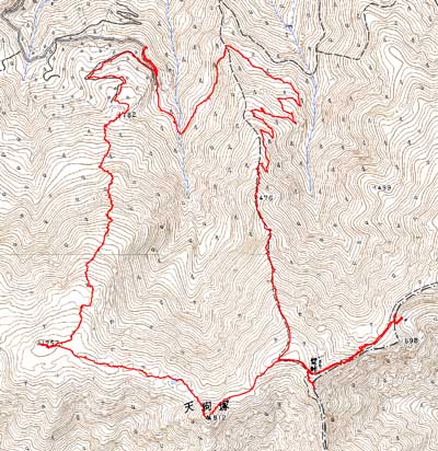 西山林道P地点 8:19 -- 西山栗園 -- 1182P 8:49 --牛の背三角点 10:59 -- 天狗塚山頂 (12:02-12:19) --お亀岩(13:15-14:25)--天狗峠(14:50-15:12) --1476P 15:46 -- 西山林道イザリ峠登山口 16:40 --P地点 17:06