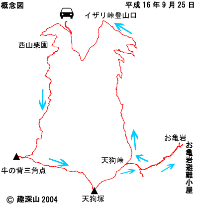 HOME > 山行記録 > 牛ノ背(1757) 天狗塚(1812) 西山栗園経由 > 平成16年9月25日
