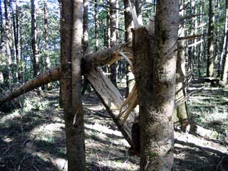 人工林のなかでは豪雨の流れた深く削られた沢や 風倒木など 台風の痕が残る。