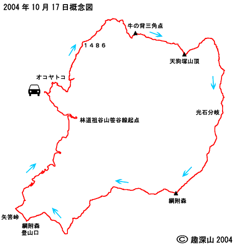HOME >山行記録 >オコヤトコ 牛の背(1757) 天狗塚 (1812) 綱附森(1643) 矢筈峠 > 平成16年10月17日