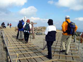 山頂の木道は完成し ベンチが 沢山あって 以前 見られた 笹原で弁当を食べるなどの光景は見られなくなった。木道を歩く限りは オーバーユースによる裸地化は防げるが植生が復活するには やはり 時間がかかるのだろう。