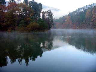 快晴の朝 満杯の松尾川ダムの水面には 蒸気がたなびき ゆっくり西側へ動いている。
