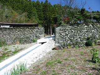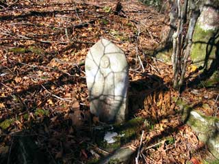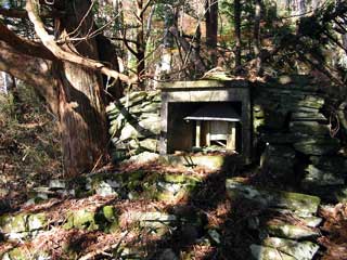 このあと 野生動物の足跡が多い道をを下っていくと 祠があり 近くに石垣が残っていた。