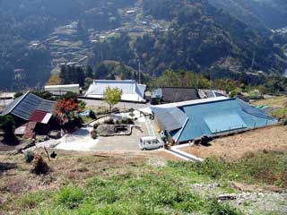 地図の標高点977mの先で 地図の通り 分岐があるが 右の方が 落合集落の下まで一気にいけそうなので右に取る。やがて 落合集落 の最上部民家へでる。