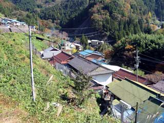 落合集落は 南面に面した斜面の集落で 下まで階段などで道路を横切りまっすぐ下る。