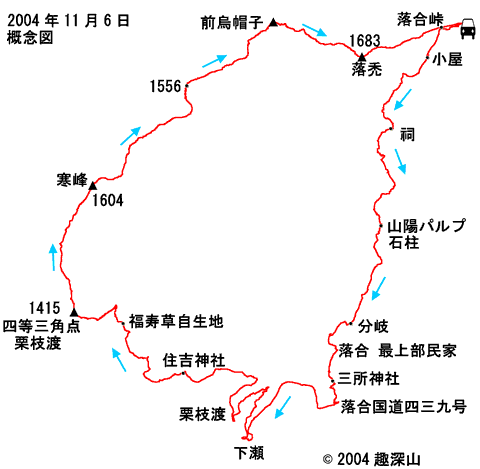 落合峠駐車場地点 8:37 -- 落合峠 8:43--落合峠旧避難小屋 8:51--祠 9:24--山陽パルプ石柱 10:24--分岐 11:00-- 落合集落最上部民家 11:11--三所神社 11:24 --落合バス停国道439号 11:36--下瀬12:00--住吉神社(12:52-13:02)--福寿草自生地 13:39-- 四等三角点(栗枝渡 1415.05m) 14:12-- 寒峰 (14:54-15:16)--1556P 15:58--前烏帽子 16:38-- 落禿 1683m 17:23-- 落合峠 17:41--落合峠駐車場地点 17:46