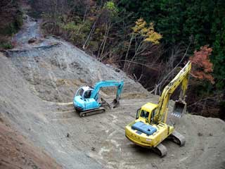 その先の 大規模な崩壊地点は 台風災害で崩落した後、 三週間前通ったときは まだ手付かずのままであったが 今回は 既に復旧工事中であった。