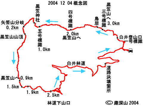 白井 県道菅生伊良原線 白井林道 駐車地点 8:35 -- 白井登山口(一号標識) 8:45 --- 二号標識 8:50 --鳥居 9:05--三号標識(黒笠山へ3.0km) 9:01 -鳥居 9:05 --四号標識(黒笠山へ2.0km) 9:24 ---五号標識(黒笠山へ1.0km)10:00 ---黒笠神社 10:12--矢筈山分岐 10:41 ---黒笠山山頂 (10:49-11:10)---標識(黒笠山0.9km) 11:57--標識(黒笠山1.5km)12:02--標識(黒笠山1.9km) 12:18--白井林道 降り口[標識(黒笠山2.5km)] 12:36 ---白井林道 13:40 --白井 県道菅生伊良原線 白井林道 駐車地点 14:46