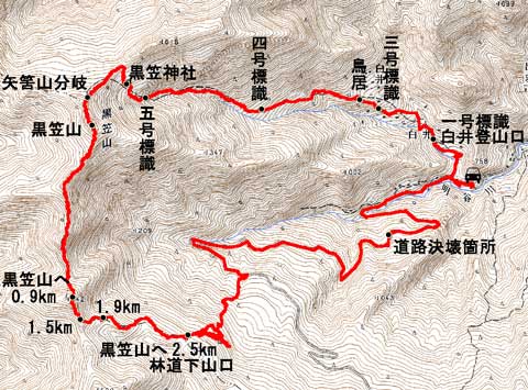 白井登山口 一号標識 二号標識 三号標識 木にくくりつけてある。 鳥居のところにある 水場 四号標識 五号標識 黒笠神社 矢筈山分岐 黒笠山 頂上を見上げる 黒笠山山頂 黒笠山から「0.9km」 実際 1.2km位か 黒笠山から1.5km 黒笠山より 1.9km 林道 降り口 黒笠山より2.5km 林道白井線 決壊箇所 復旧工事中 路肩に仮置きされている倒壊した擁壁のコンクリート