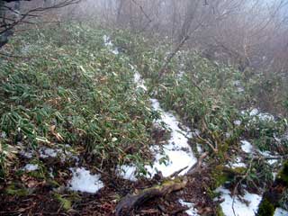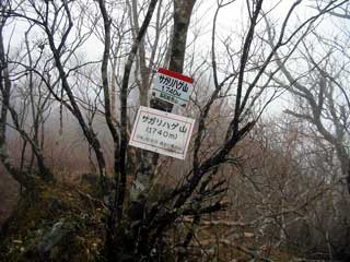 サガリハゲにむかって縦走を開始、丸見谷からの分岐から先は、道は ほぼ獣道状態になり、雨とガスでなかなか はかどらない。