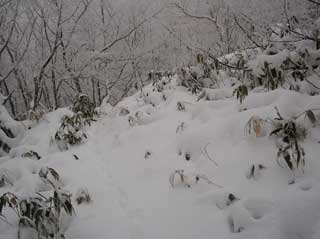 案の定 稜線は 雪が笹の上に乗った状態で 一番中途半端な状態で 一歩ごとに 笹の上の 雪のすべてを 落としながら かつ地面まで潜りながらの 難行苦行が始まった。