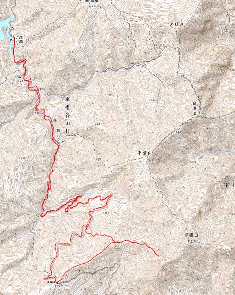 深淵 駐車地点 5:51 -- 営林小屋 7:24 -- 落合峠 (10:22-10:48) -- サガリハゲ分岐(13:41-14:06)ここで断念 --- 三加茂東祖谷山線 14:59-- 営林小屋 15:50 --石堂神社 16:12 -- 深淵 駐車地点 16:52