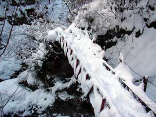 一宇村 木地屋にて 林道を歩いているうちに明るくなる 鉄の橋 欄干まで一杯の雪 徒渉地点 尾根のラッセル 木々の間から白滝山方面がよく見える
