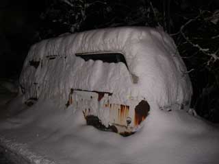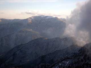 矢筈山頂 16:07「-7.2度 5m 南よりの風 寒い。祖谷の谷は 真っ白。 時折 ガスの固まりが 流れるが、三嶺の方にも ガスがかかったりする。剣山、次郎笈にも 時折ガス。新雪はズボズボ潜る。縦走は断念。無理せず引き返そう。」