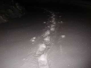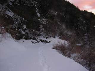 - 帰りは まだ 薄暗い内に 核心部を過ぎてなんとか 下山できたが、降雪中や天候崩れで トレースが消えるような 時には もっと早めに 下山の決定を出さなくては。