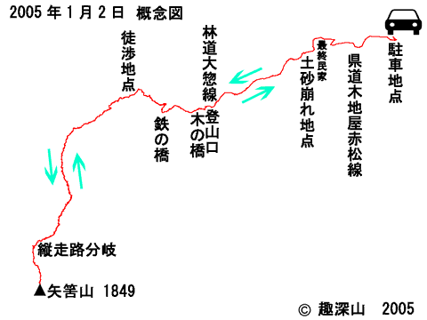 - 優先順序 一位の矢筈山 を最短距離で 登ろうと 計画を変えた。うまくいけば 下山で 周回コースをとれる。