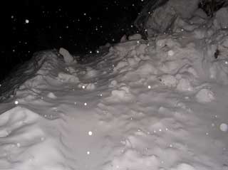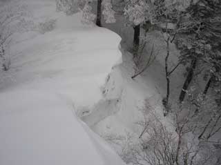 営林小屋を過ぎ、しばらく行くと 山側から 大きな雪塊が落ちている。