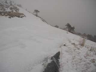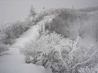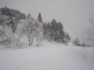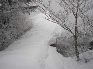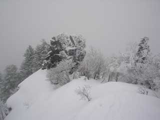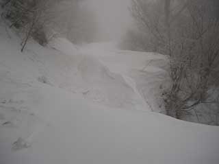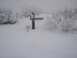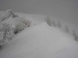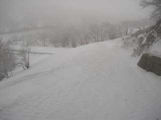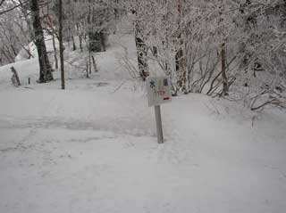 落合峠「-8度 6m北風 ガス 落合側への道も 雪で覆われている」