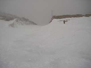 山頂直下は クラストした雪の上に新雪が薄く 乗っていていてイヤな感じだ。