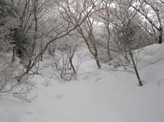 山道は雪が締まって歩きやすくなっていて、気持ちよく歩ける。ただ 雪が多いので 樹木の枝が行く手を遮り 邪魔になるところが多く出てくる。その都度 くぐったり 乗り越えたりするのが大変だが ラッセルの無い分助かる。