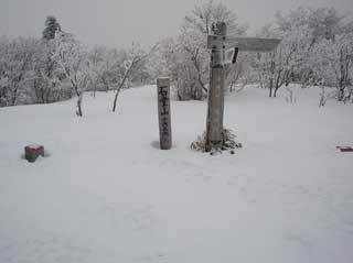 矢筈山山頂「マイナス7.0度 1-2m 風が弱くなってきた 視界100m位 ガス時折雪 一時 ガスが薄くなるが またガス」