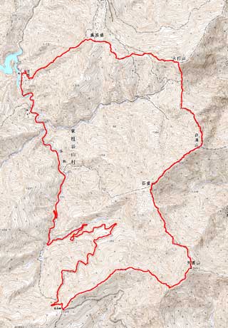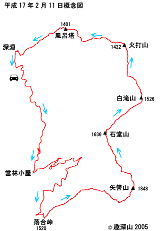 深淵 駐車地点 5:16 --落合峠 (8:05-8:28) -- 矢筈山 (10:49-11:27)-- 石堂山 (12:40-12:55) -- 白滝山 (13:43-14:02) --火打山(15:02-15:14)-- 風呂塔(16:05-16:23) -- 深淵 駐車地点 17:35