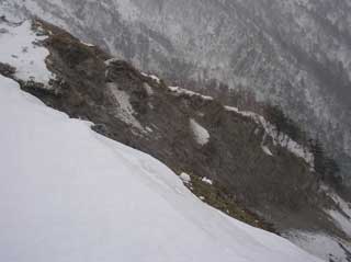 イザリ峠南面は ブロック崩壊と 雪崩れになっていた。 亀裂も多い。