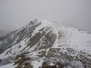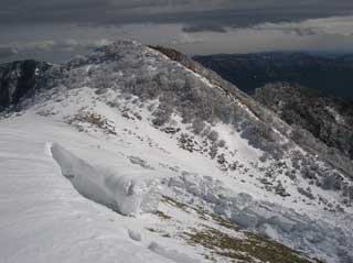 三嶺北西尾根 1806mピークが見える 1806mピークをあとに フスベ谷下降点標識 三嶺山頂 三嶺を振り返る シカザレ上部 崩壊 シカザレ下を見る 縦走路 定点観測点 西熊山 南面雪解け進む 三嶺を見る 西熊山南面 雪解け 西熊山山頂 西熊山西側縦走路 お亀岩お亀岩避難小屋 お亀岩お亀岩避難小屋と西熊山 お亀岩 お亀岩をあとに イザリ峠登り お亀岩 イザリ峠間雪庇 登り 綱附森分岐から三嶺 イザリ峠南西面 雪崩 イザリ峠南西面 南西面 雪崩 亀裂が入る 天狗塚の登り 牛の背 天狗塚山頂 天狗の池と天狗塚 牛の背から天狗塚 1640m付近 牛の背を見上げる 樹林限界付近 イザリ峠登山口 ふるさと林道阿佐名頃線