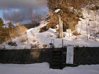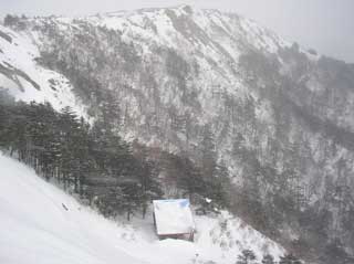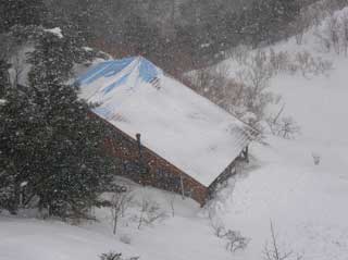お亀岩避難小屋 はブルーシートの屋根の上の積雪は すっかり雪を落としていた。